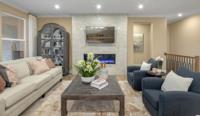 . Electric fireplace with tile surround gives the family room a chic and modern